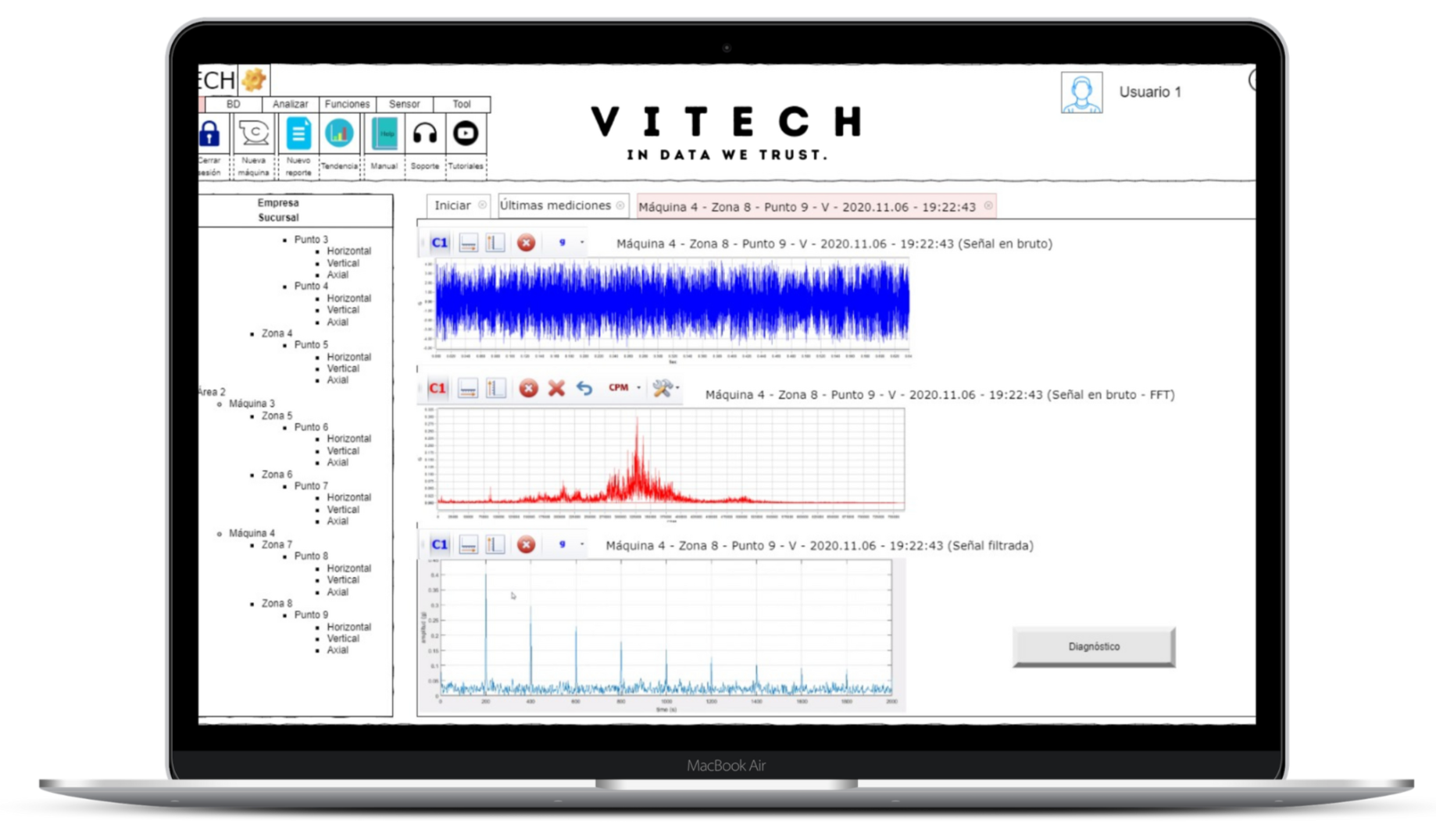 VITECH captura datos de vibración y de proceso en alta resolución, aplica análisis avanzado de señales y detecta indicios tempranos de falla. Los ingenieros reciben diagnósticos claros, paneles de tendencias y alertas automáticas para planificar intervenciones, reducir paradas y extender la vida útil, en sitio o en la nube, con integración OPC-UA/Modbus.